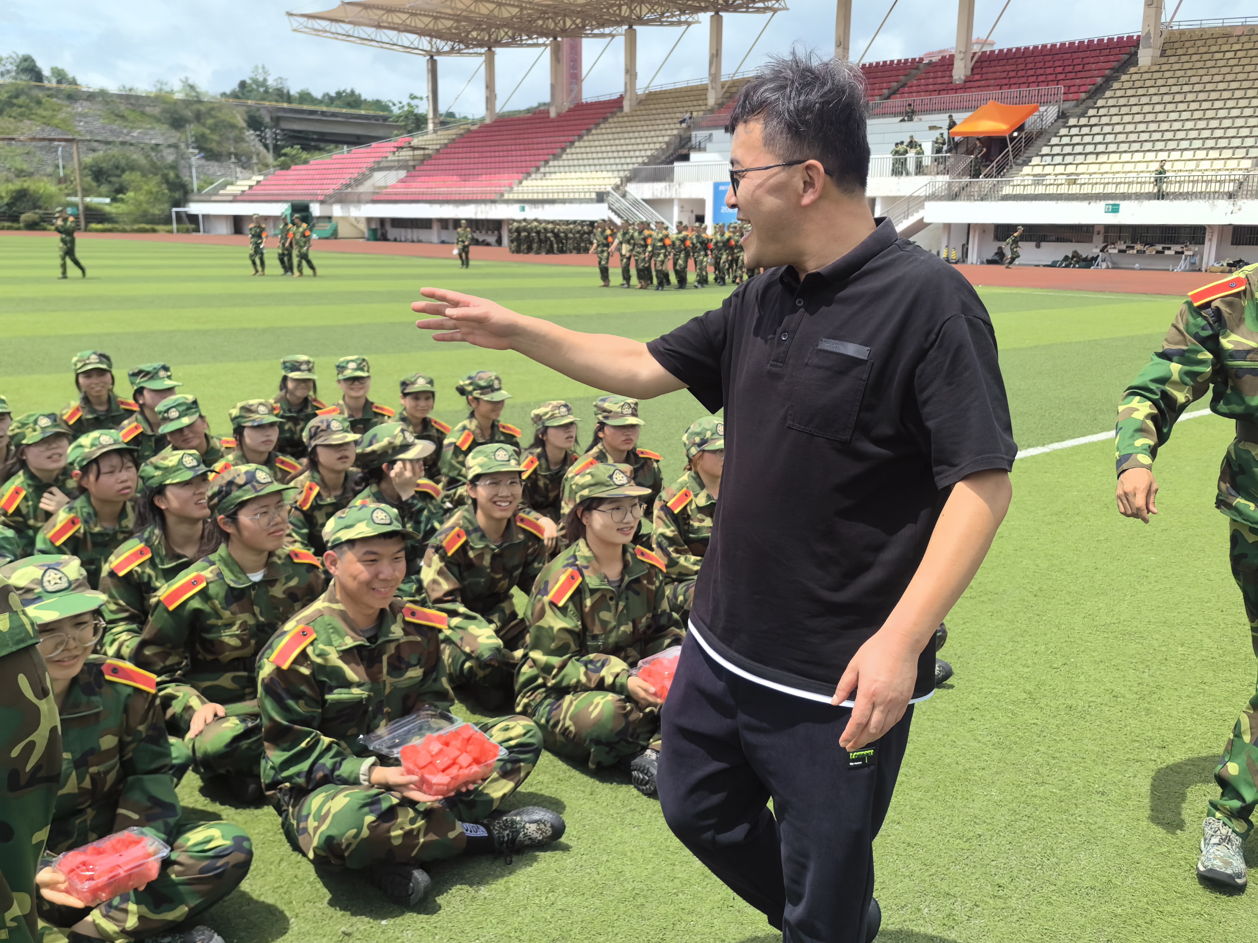 大家到达现场时,员工们正顶着烈日,以饱满的精神状态进行军训。为了缓解同学们在炎热天气下的疲惫,谭健副书记和辅导员们将冰凉的西瓜送到员工手中。这份突如其来的清凉,让同学们感受到了公司老师的深切关怀,也让他们更加坚定了战胜困难的信心。