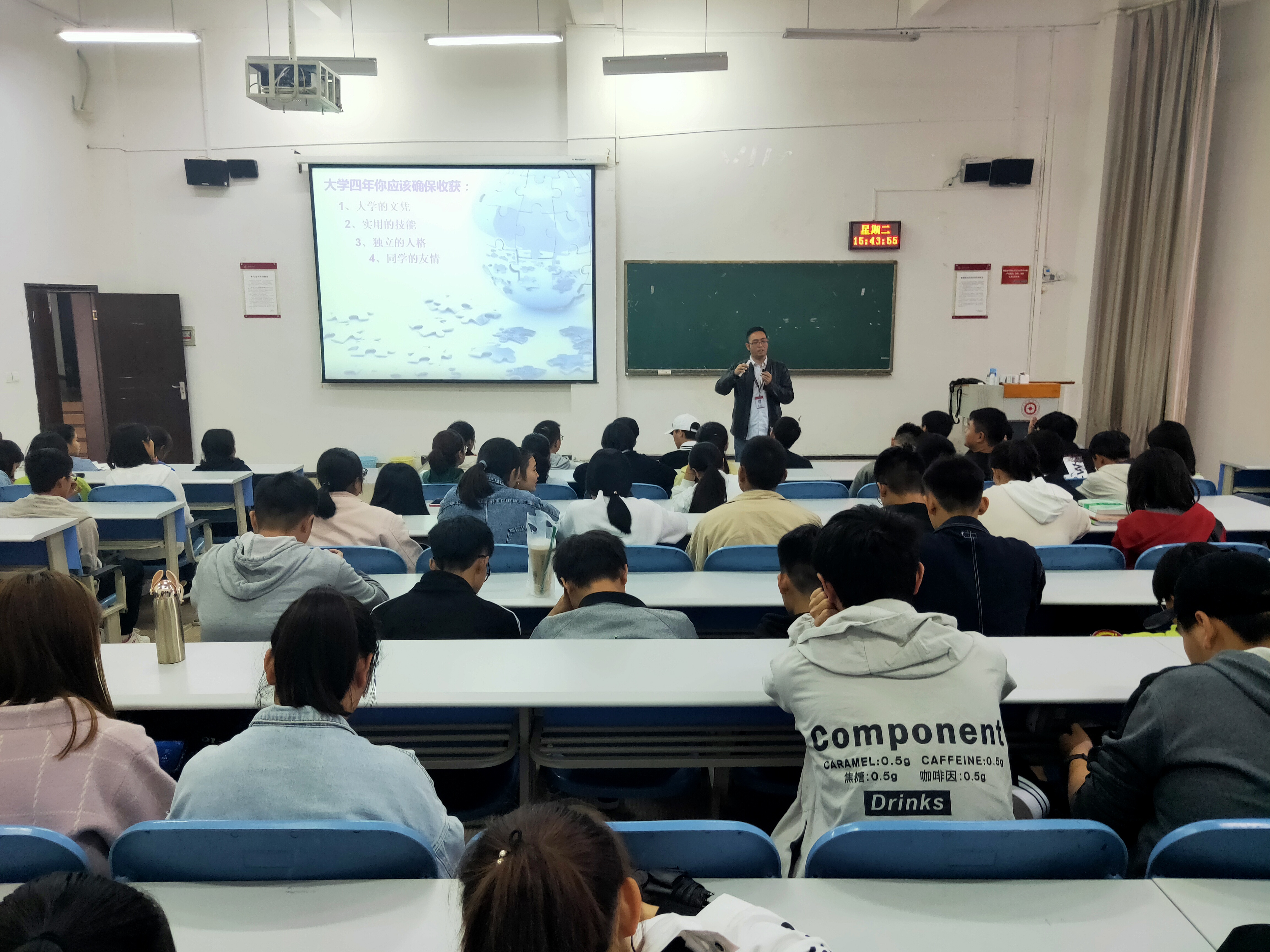 郑传行教授通过自身经历阐明职业生涯规划的重要性,引导同学们寻找自己的职业定位。通过分析当下就业形势指导同学们如何规划老员工活。同时强调在一生当中选择的重要性, 相同的学校、相似的出身,有的人成功了有的人却失败了,这在于选择的不同。最后强调,大学不是“游乐场”,同学们应该找到适合自己的学习方法,参与不同的社会实践,规划好自己的老员工活,努力为实现自己的目标而不懈奋斗。