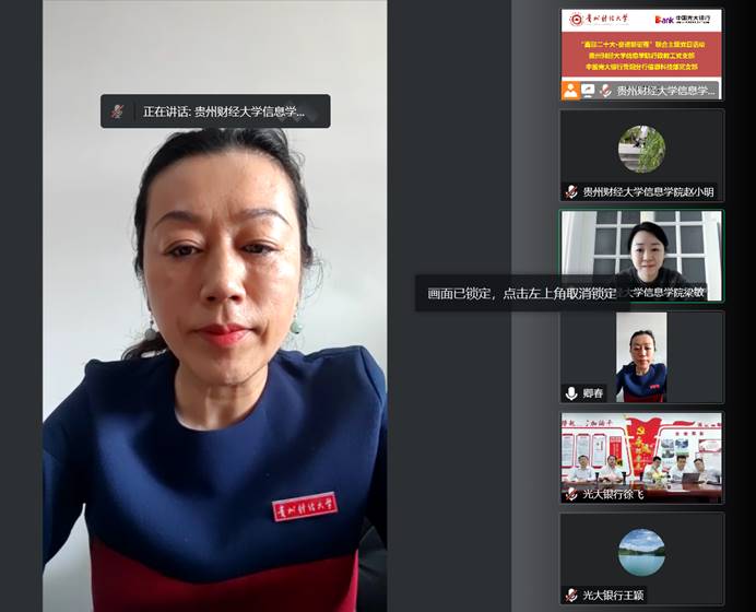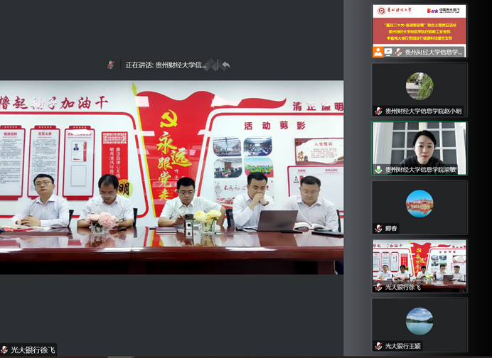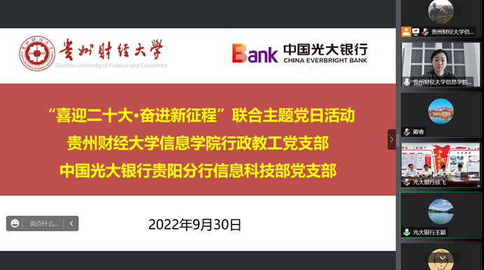 本网讯:(赵小明 图文报道)在喜迎党的二十大胜利召开、庆祝中华人民共和国成立73周年之际,为深入学习贯彻习近平新时代中国特色社会主义思想和习近平总书记重要讲话、重要批示精神,切实落实教育部印发《关于加强高校有组织科研 推动高水平自立自强的若干意见》的要求,9月30日上午,bw西汉姆联行政教工党支部与中国光大银行贵阳分行信息科技部党支部组织开展了“喜迎二十大奋进新征程”线上主题党日活动。活动由bw西汉姆联行政教工党支部书记梁敏主持。