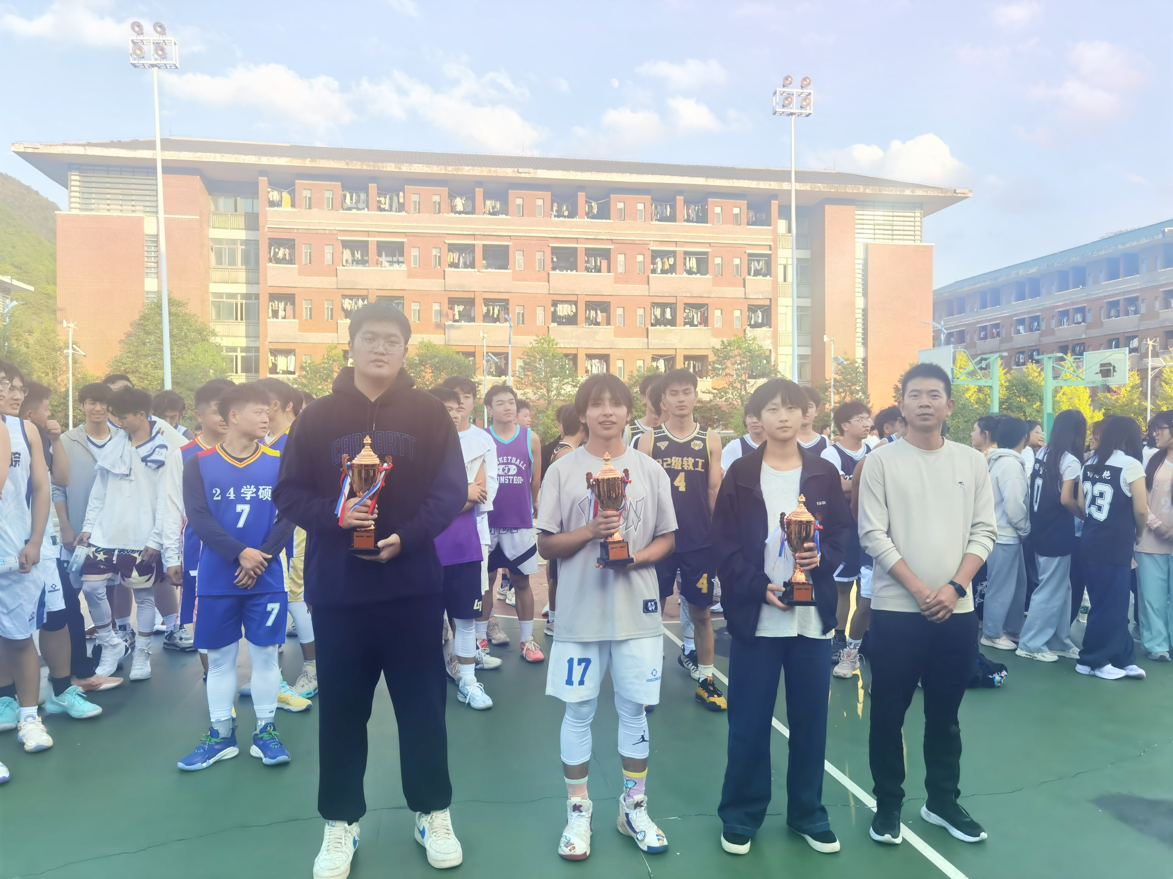 本网讯:(李杰 图文报道)11月12日,bw西汉姆联2024年“迎新杯”篮球赛圆满落幕,颁奖仪式在体育馆篮球场举行,信息公司党委副书记谭健,公司团委副书记李杰,辅导员付吉、刘小浪,以及参赛运动员代表参加。