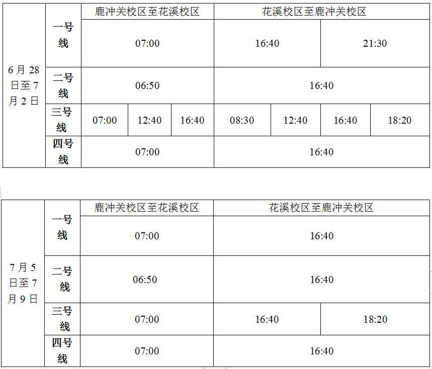 按照集团统一安排,公司鹿冲关校区、花溪校区进入期末考试阶段,7月2日考试结束,为满足期末考试需要和行政科研工作的开展,现对交通车作如下调整: